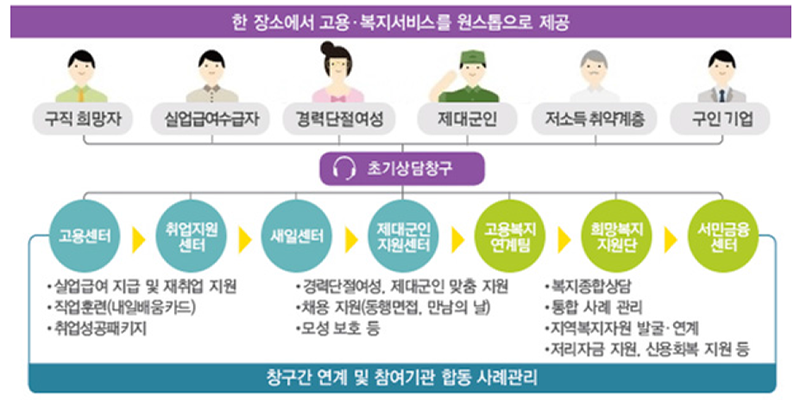 고용노동부, 보건복지부, 여성가족부, 금융위원회 등 여러 부처가 참여해 구직자, 취업취약계층, 저소득층, 경력단절여성, 중장년, 제대군인 등 누구나 쉽게 이용할 수 있습니다