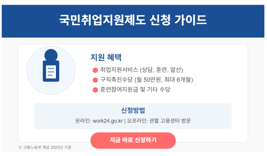 국민취업지원제도 신청방법, 아직도 헷갈리시나요? 2025년 최신 기준으로 국민취업지원제도의 신청 절차부터 준비서류, 온라인 신청 방법, 서류 제출까지 A to Z로 정리했습니다. 실수 없이 신청하고, 지원금과 맞춤형 취업 프로그램을 놓치지 마세요!
