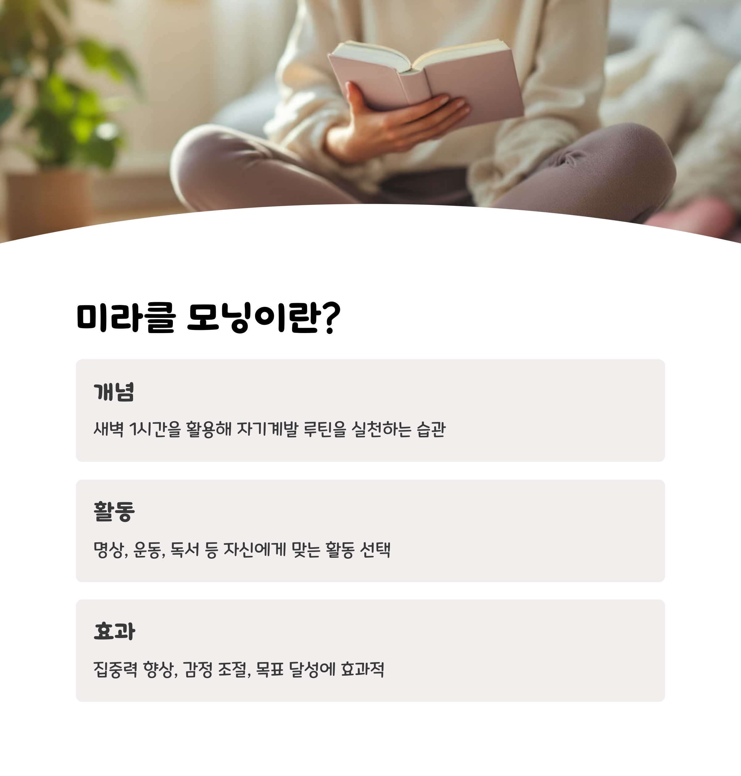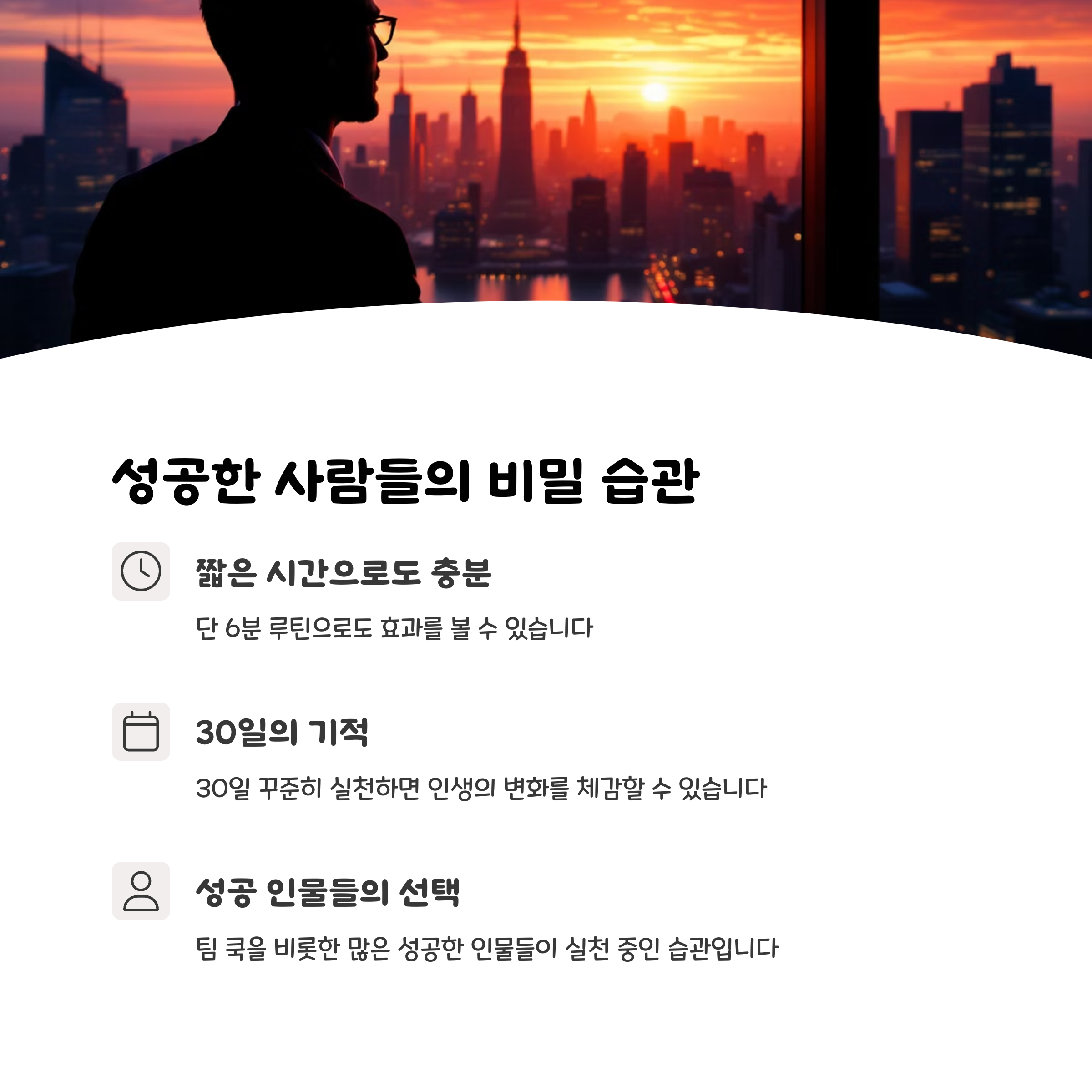 | 미라클 모닝 루틴 | 명상, 확언, 시각화, 운동, 독서, 기록으로 구성 |