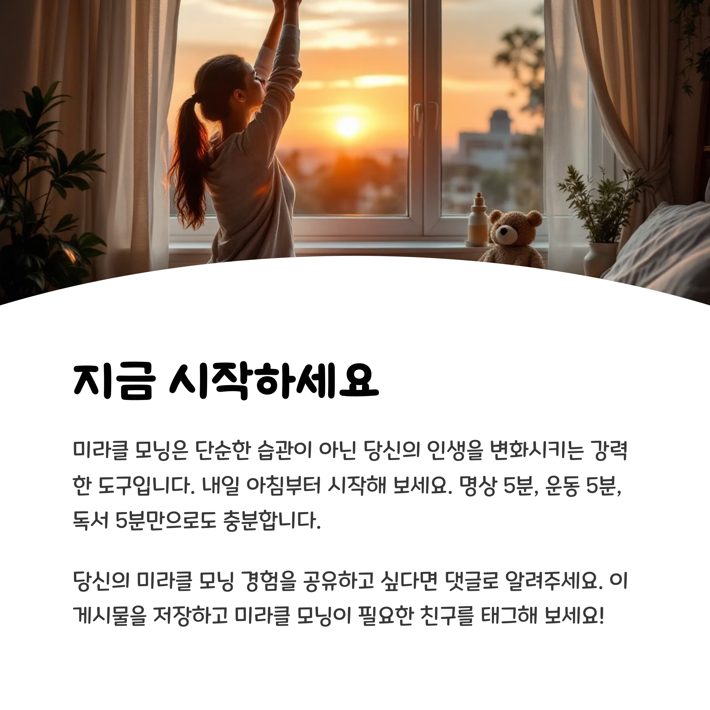 미라클 모닝은 단순히 하루의 시작이 아닙니다. 그것은 자신에 대한 믿음과 주도권을 되찾는 과정이며, 자기 성장의 가장 확실한 루트입니다. 매일 아침 일찍 눈을 뜨는 작은 선택이 삶의 흐름 전체를 바꾸는 큰 전환점이 될 수 있습니다. 처음 10일은 낯설고 피곤할 수 있지만, 30일의 루틴을 넘어서는 순간 전혀 다른 나를 만나게 될 것입니다. 당신도 오늘부터 미라클 모닝을 실천해보세요.