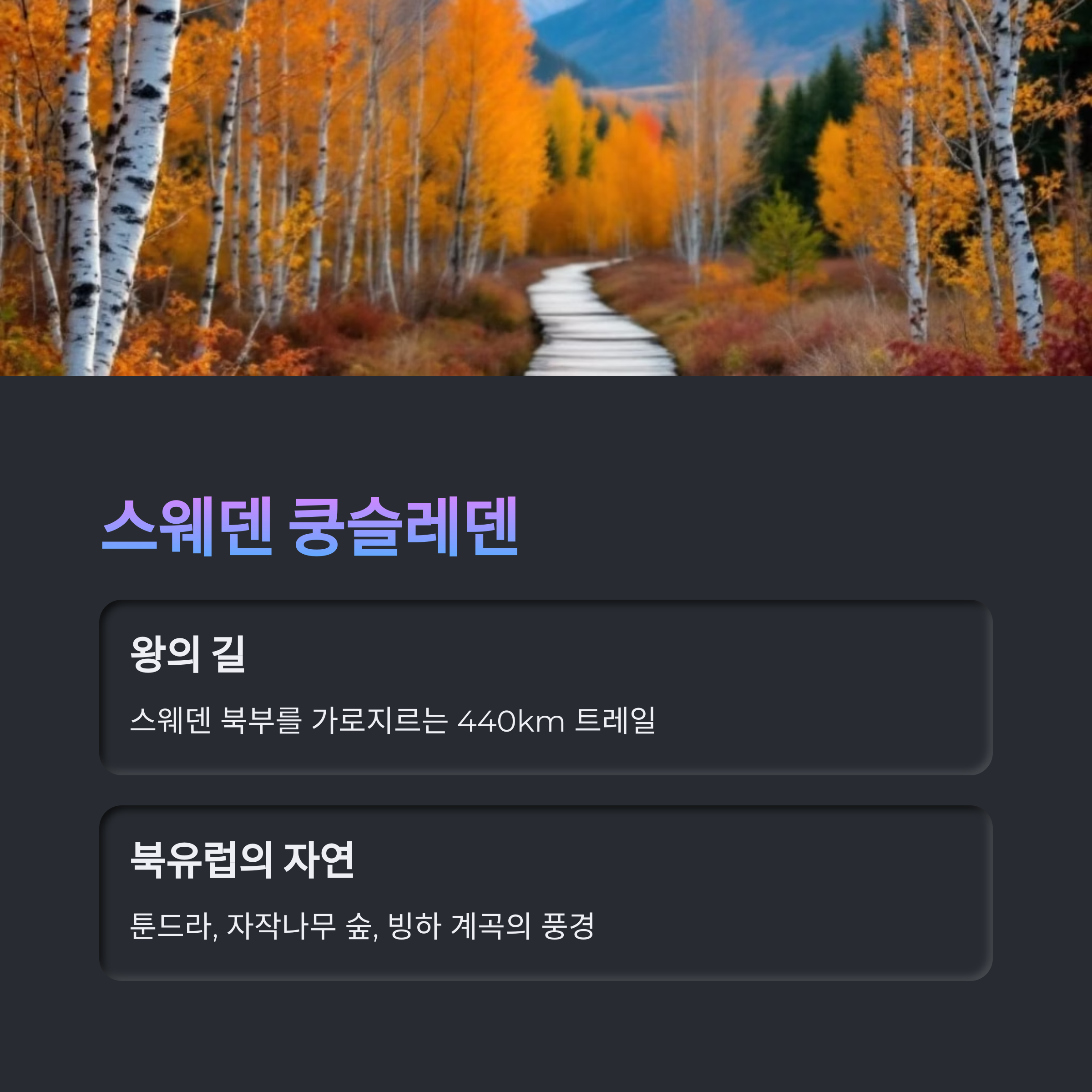 북극권 트레킹의 대명사, 쿵슬레덴은 ‘왕의 길’이라는 뜻처럼 웅장한 자연 속을 걷는 코스예요. 스웨덴의 라플란드 지역에 위치하며, 무려 440km에 달하는 장거리 트레일이지만, 4구간으로 나뉘어 있어 원하는 만큼만 걸어볼 수 있답니다. 오로라를 볼 수도 있다는 보너스는 덤!