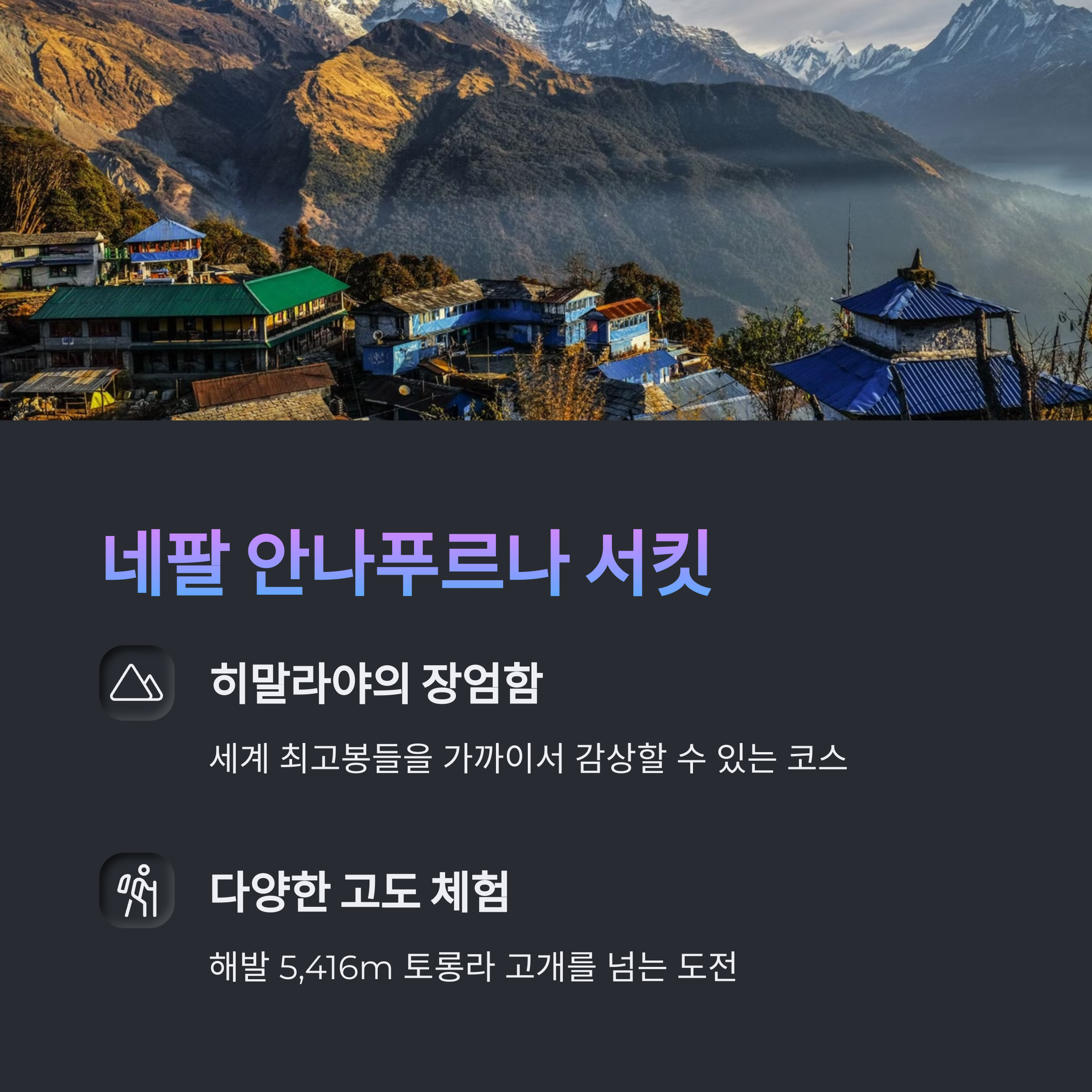 히말라야의 거대한 품 안에서 걷는다는 건 상상만으로도 숨이 막힐 만큼 벅차죠. 안나푸르나 서킷은 해발 5,000m를 넘나드는 고산 트레킹으로, 날씨와 체력만 허락한다면 인생에서 꼭 한 번은 경험해봐야 할 코스입니다. 중간 중간 현지인들과 교류하며 네팔 문화를 직접 느낄 수 있다는 점도 특별해요.