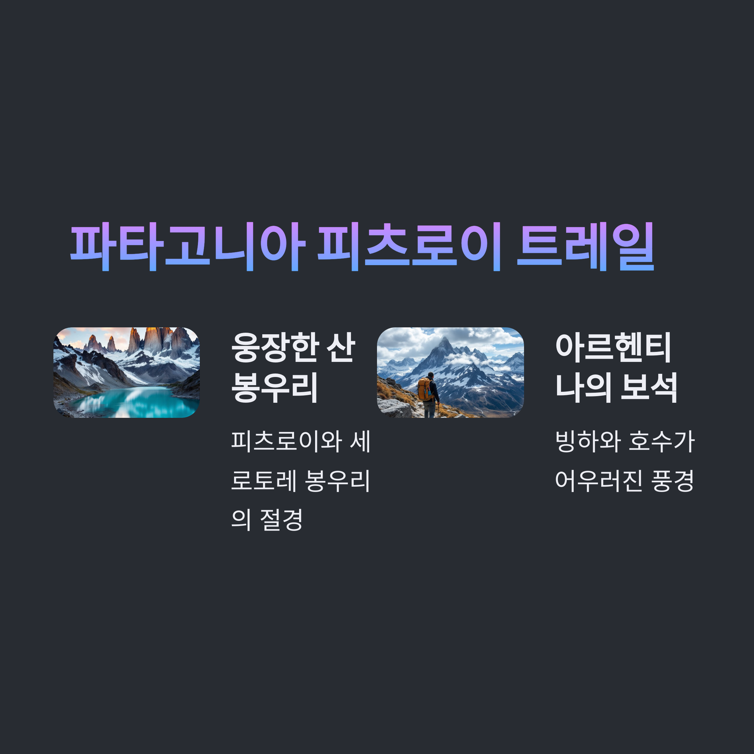 남미 파타고니아의 피츠로이 트레일은 마치 '세상의 끝'에 온 듯한 착각을 불러일으키죠. 날씨는 변덕스럽고 바람은 강하지만, 해가 뜨는 순간 드러나는 피츠로이 봉우리는 모든 고생을 잊게 만듭니다. 짧게는 1~2일, 길게는 4~5일 일정으로도 충분히 즐길 수 있어요.