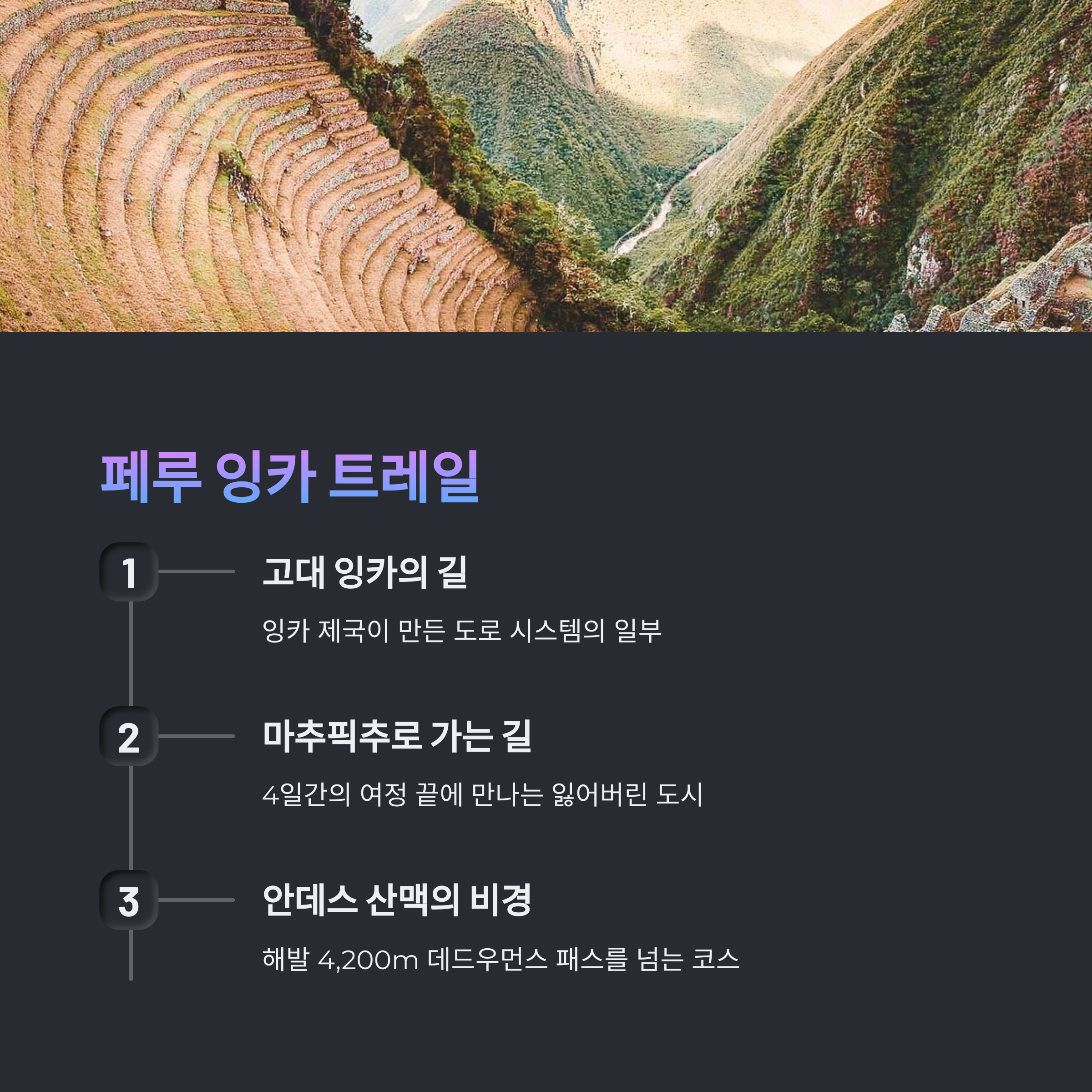 잉카 문명의 숨결을 따라 걷는 잉카 트레일은 고대 유적과 대자연이 어우러진 완벽한 하이킹 코스입니다. 최종 목적지는 세계 7대 불가사의 중 하나인 마추픽추! 하지만 그 여정 자체가 더 감동적이에요. 하루 평균 8~10시간 걷는 일정이라 사전 준비는 필수랍니다.