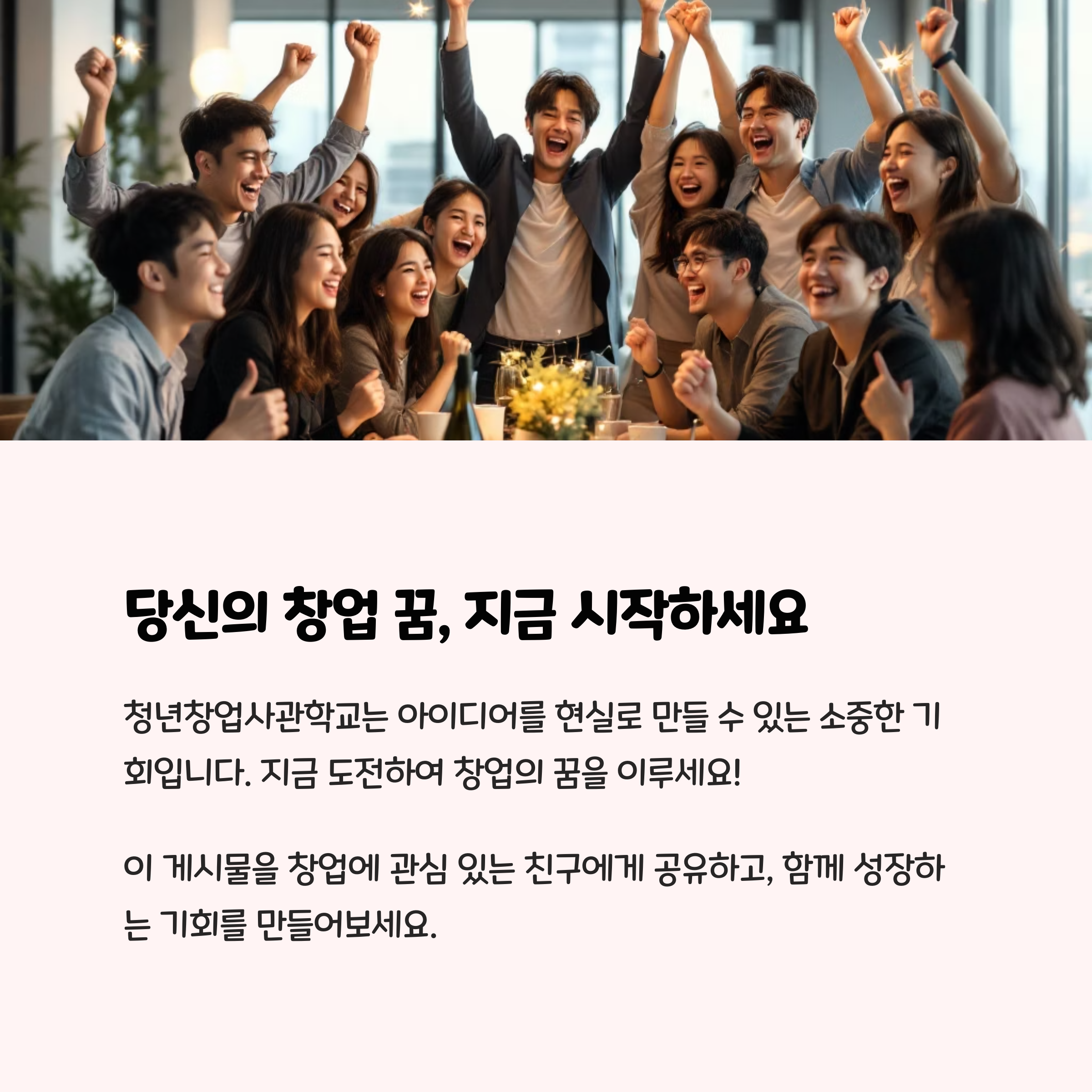청년창업사관학교는 단순히 지원금을 받는 곳이 아닌, 창업가로서 한 단계 성장할 수 있는 기회의 장입니다. 이 프로그램을 통해 자신만의 사업을 구체화하고, 사회에 긍정적인 가치를 전달하는 기업으로 도약할 수 있습니다. 과정을 준비하는 동안 느낀 점은 ‘준비한 만큼 결과가 나온다’는 것이었습니다. 실전처럼 연습하고, 진심을 담아 서류와 발표를 준비한다면 분명 좋은 결과가 따를 것입니다. 창업의 길이 결코 쉽지 않지만, 그 여정을 통해 나와 세상이 함께 성장하는 경험을 하게 될 것입니다.