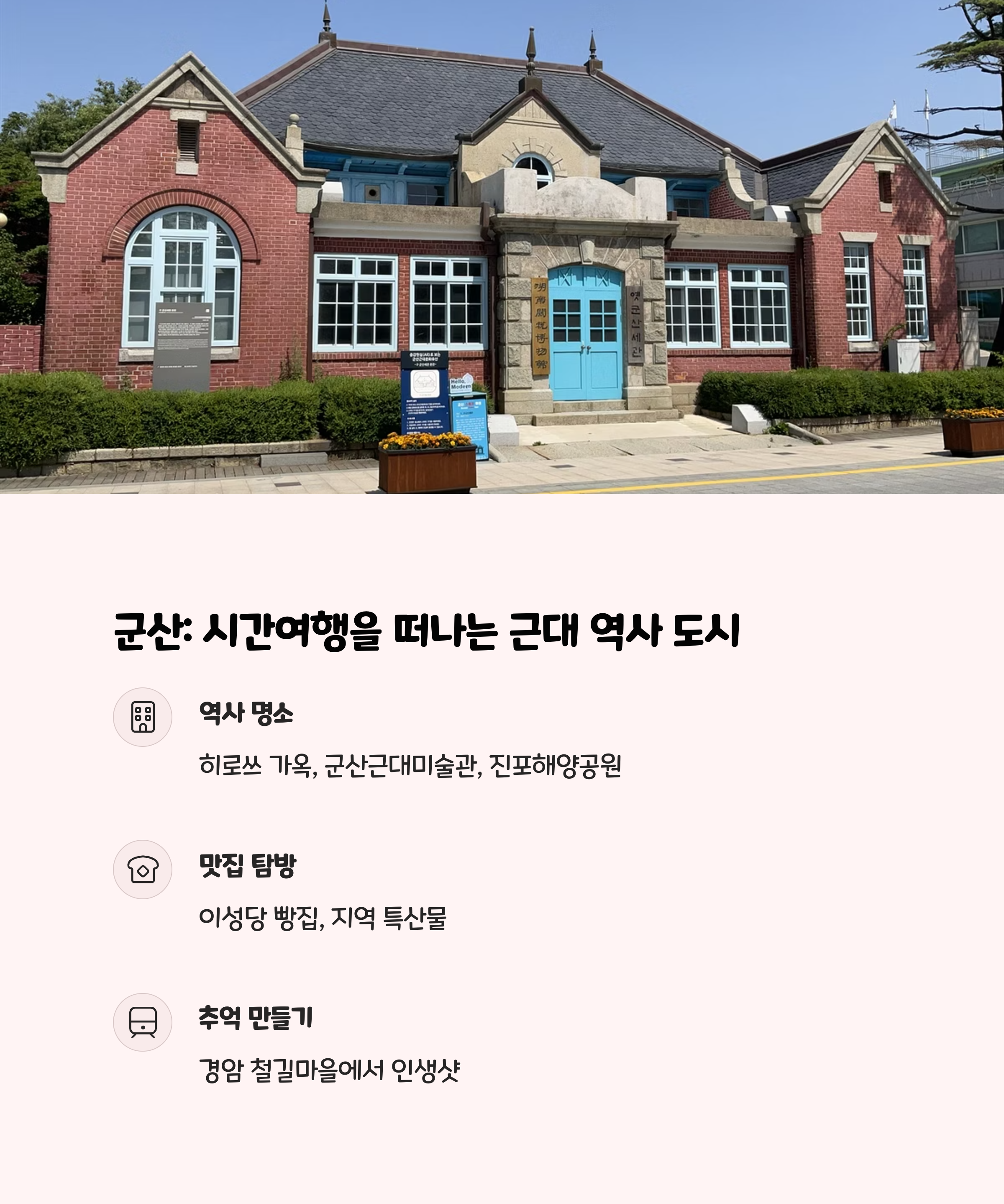 이성당 빵집, 경암 철길마을 등 식도락과 추억을 모두 만족시킵니다.