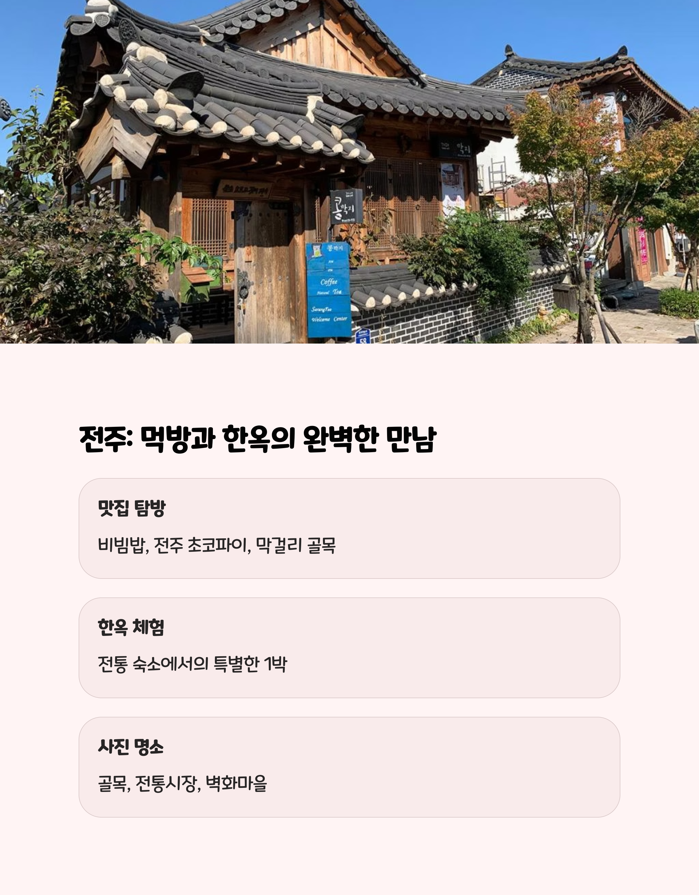 전주 한옥마을은 전통과 현대가 잘 어우러진 여행지입니다.