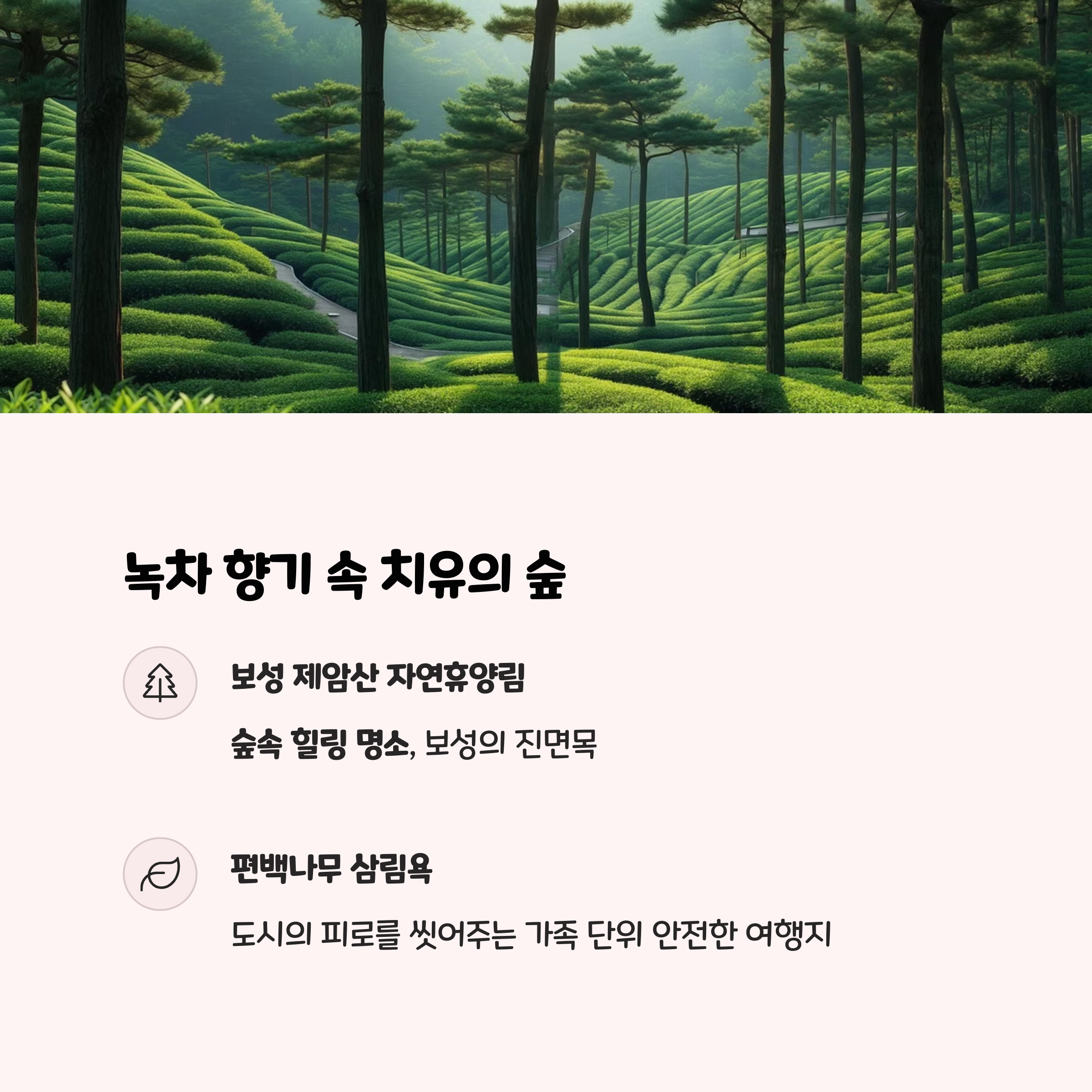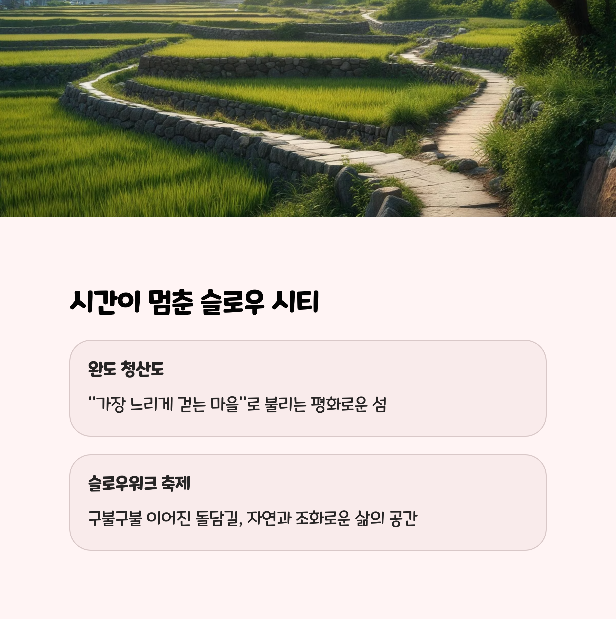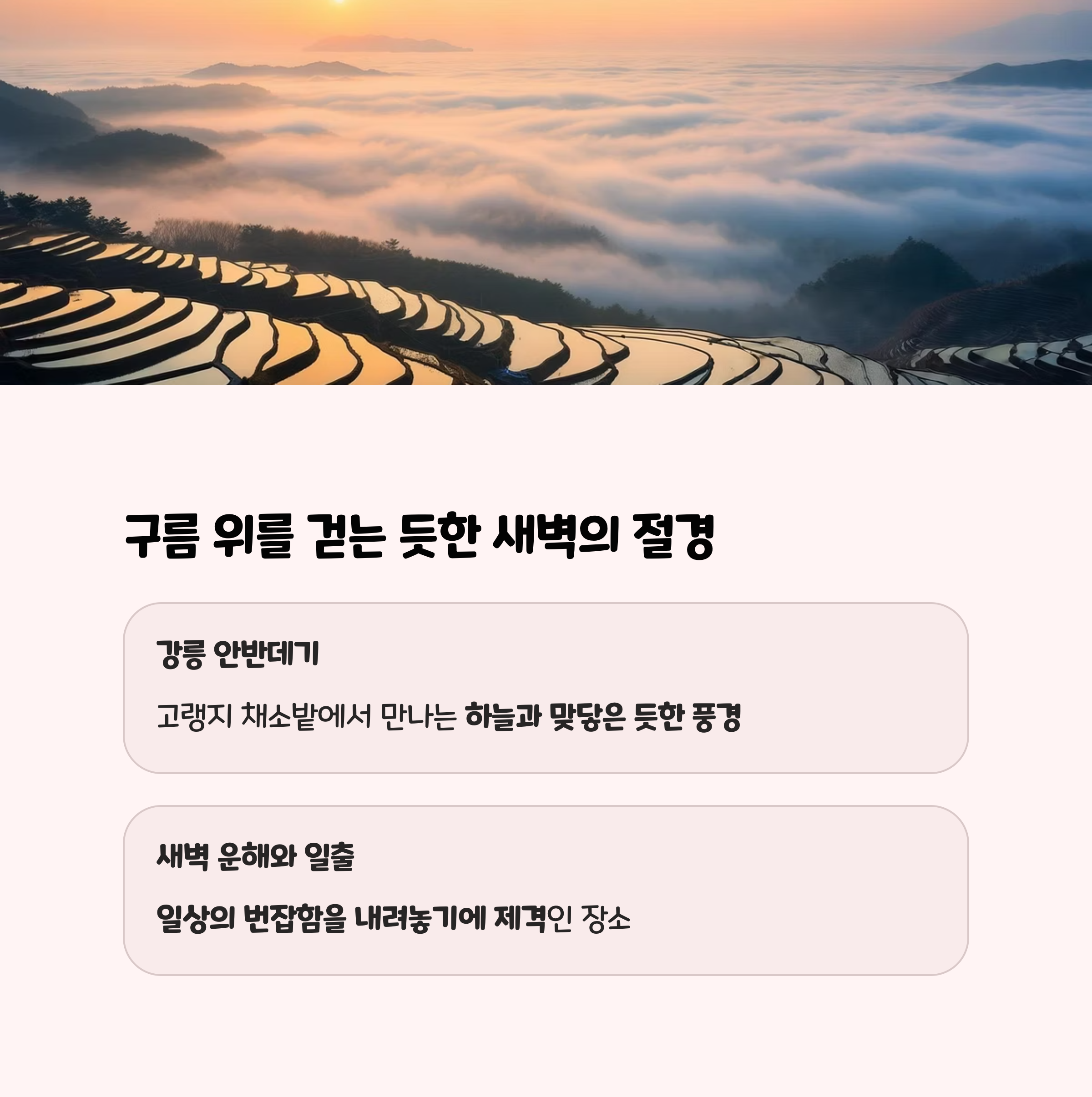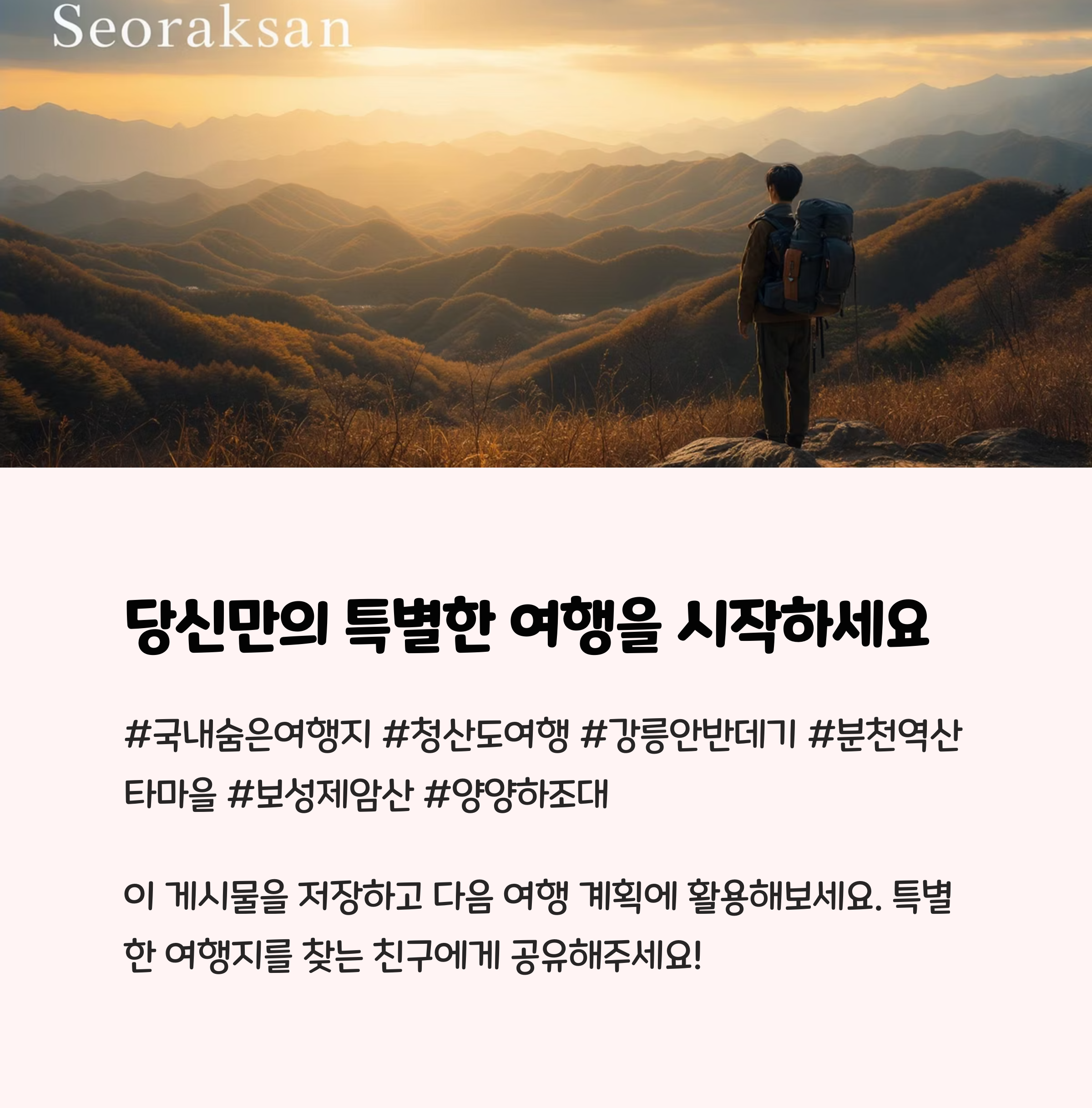 | 강릉 안반데기, 완도 청산도, 보성 제암산 | 봄 꽃길, 여름 숲속, 가을 일출, 겨울 눈 풍경 | 힐링여행, 사진명소, 가족나들이, 자연속 쉼 |