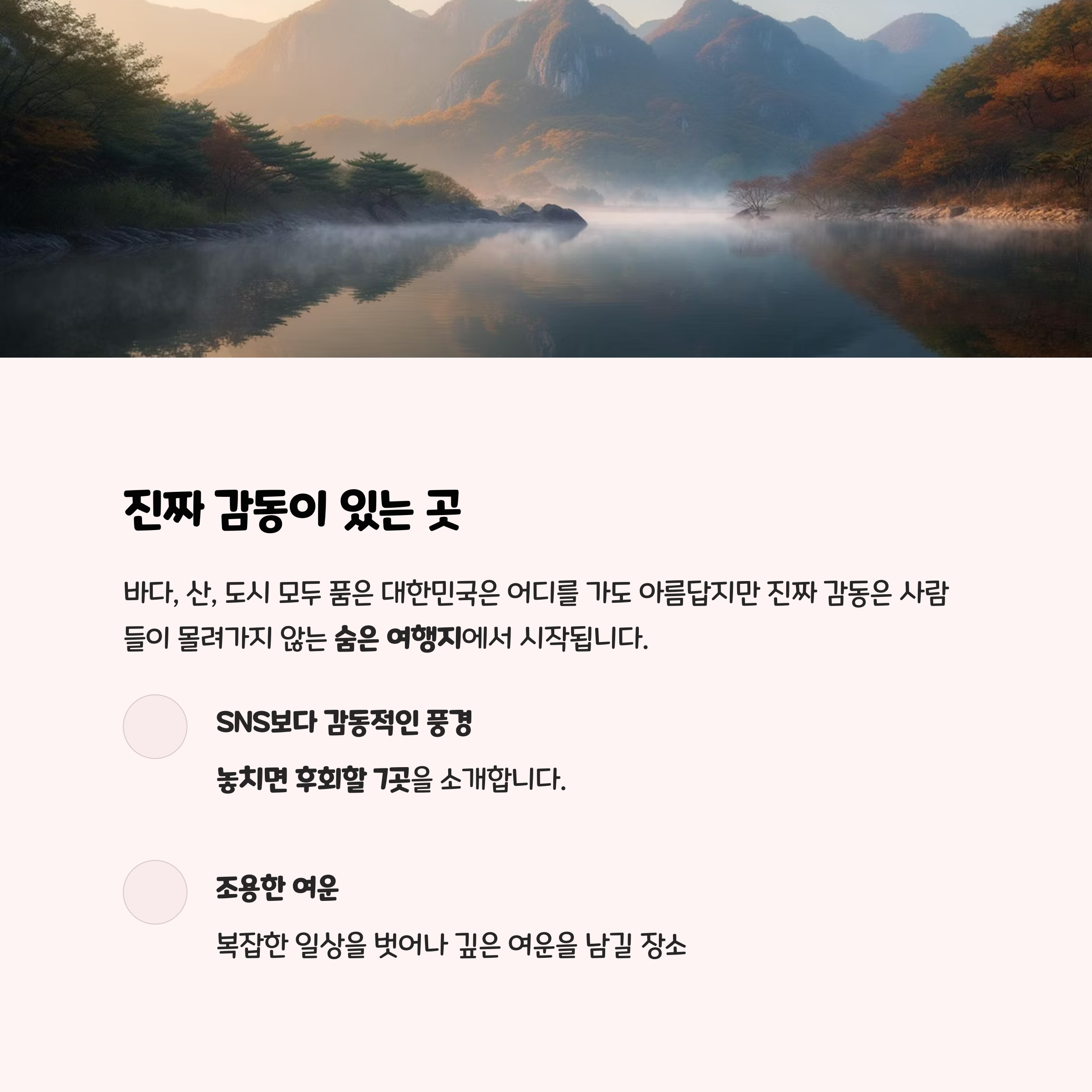 | 국내 숨은 명소 | 덜 알려졌지만 감성 넘치는 여행지 7곳 추천 |