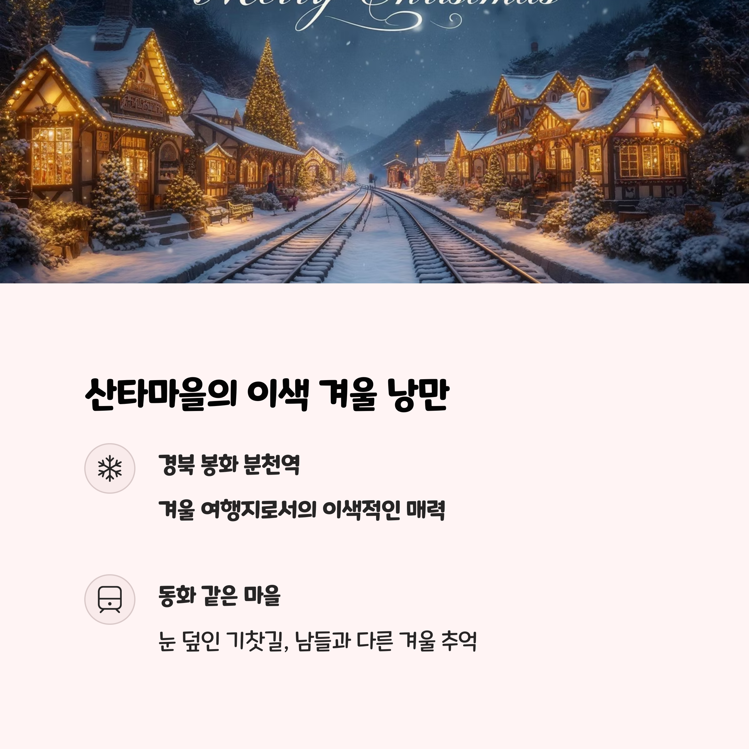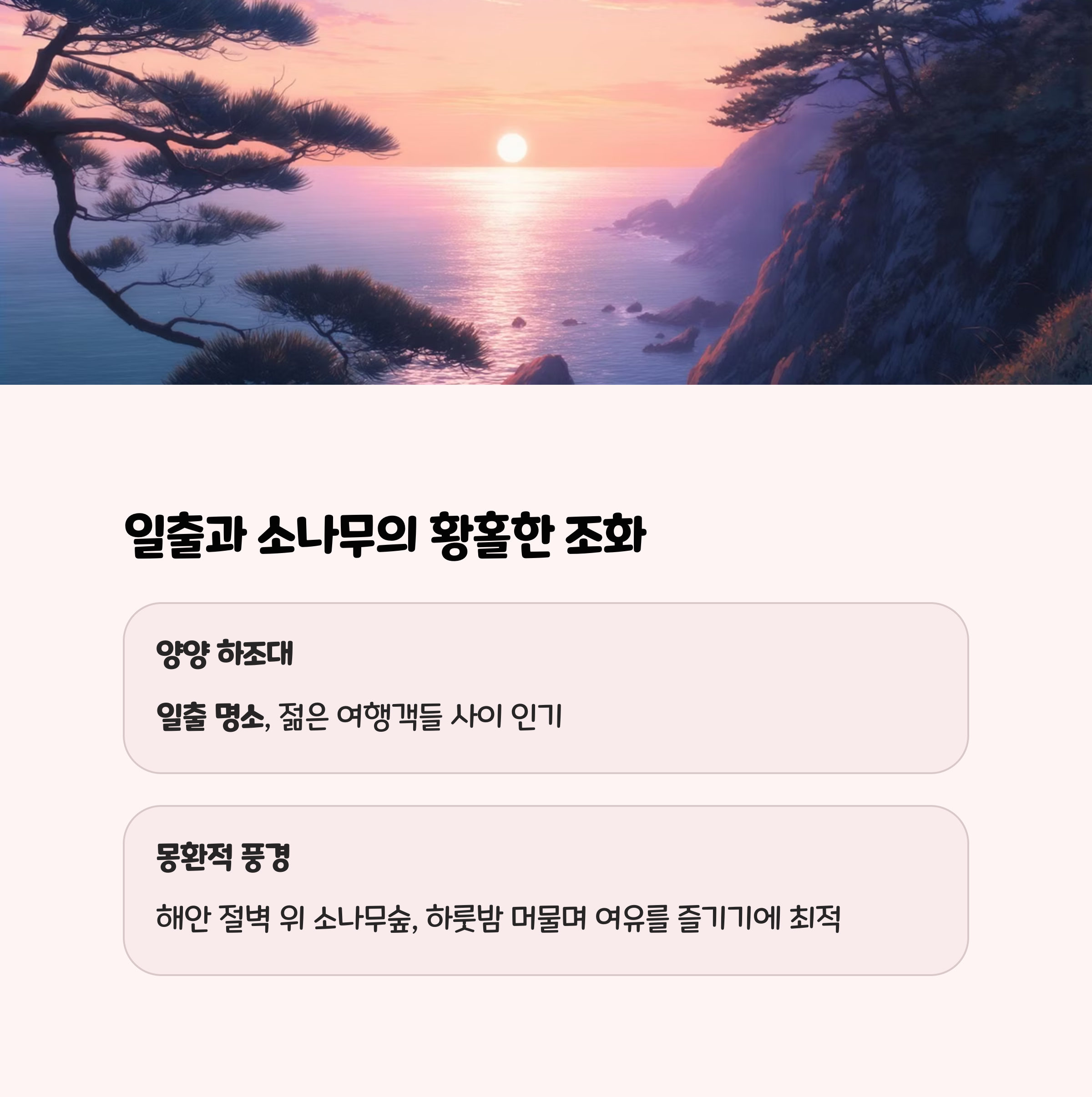 겨울엔 산타마을로 변신하는 봉화 분천역이 동화 속 한 장면처럼 여행의 낭만을 더해줍니다. 제천 의림지는 1,300년의 역사를 간직한 고대 저수지로, 벚꽃과 연꽃이 어우러지는 산책길에서 고즈넉한 시간을 보낼 수 있습니다. 양양 하조대의 해안 절벽과 일출, 그리고 소나무숲이 어우러진 풍경은 도시에서 느낄 수 없는 깊은 감동을 안겨줍니다. 봄, 여름, 가을, 겨울 언제 찾아도 계절마다 다른 매력을 보여주는 곳들이 여러분의 마음을 사로잡을 것입니다.