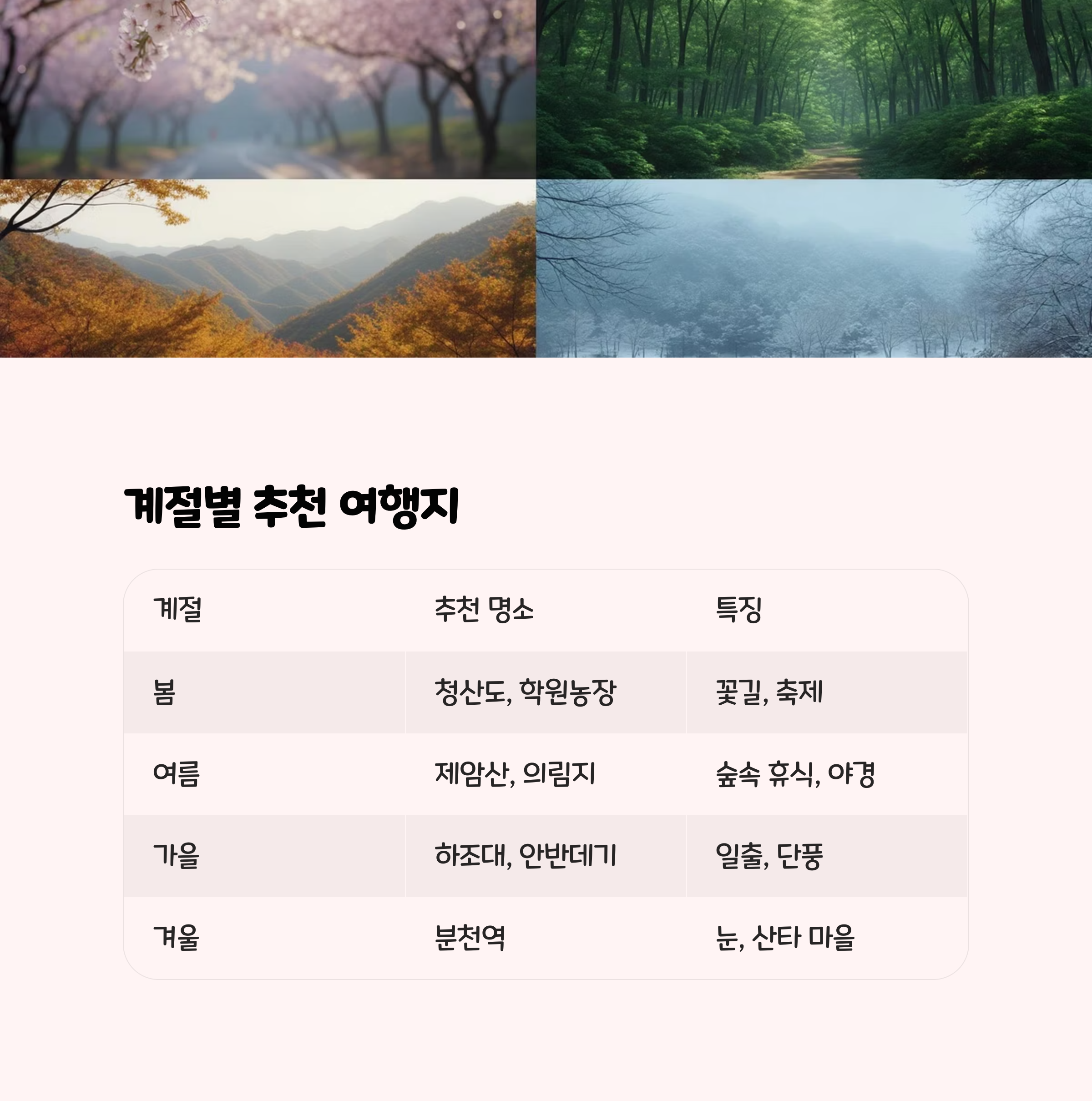 | 계절별 추천 | 봄, 여름, 가을, 겨울 맞춤형 여행지 제안 |