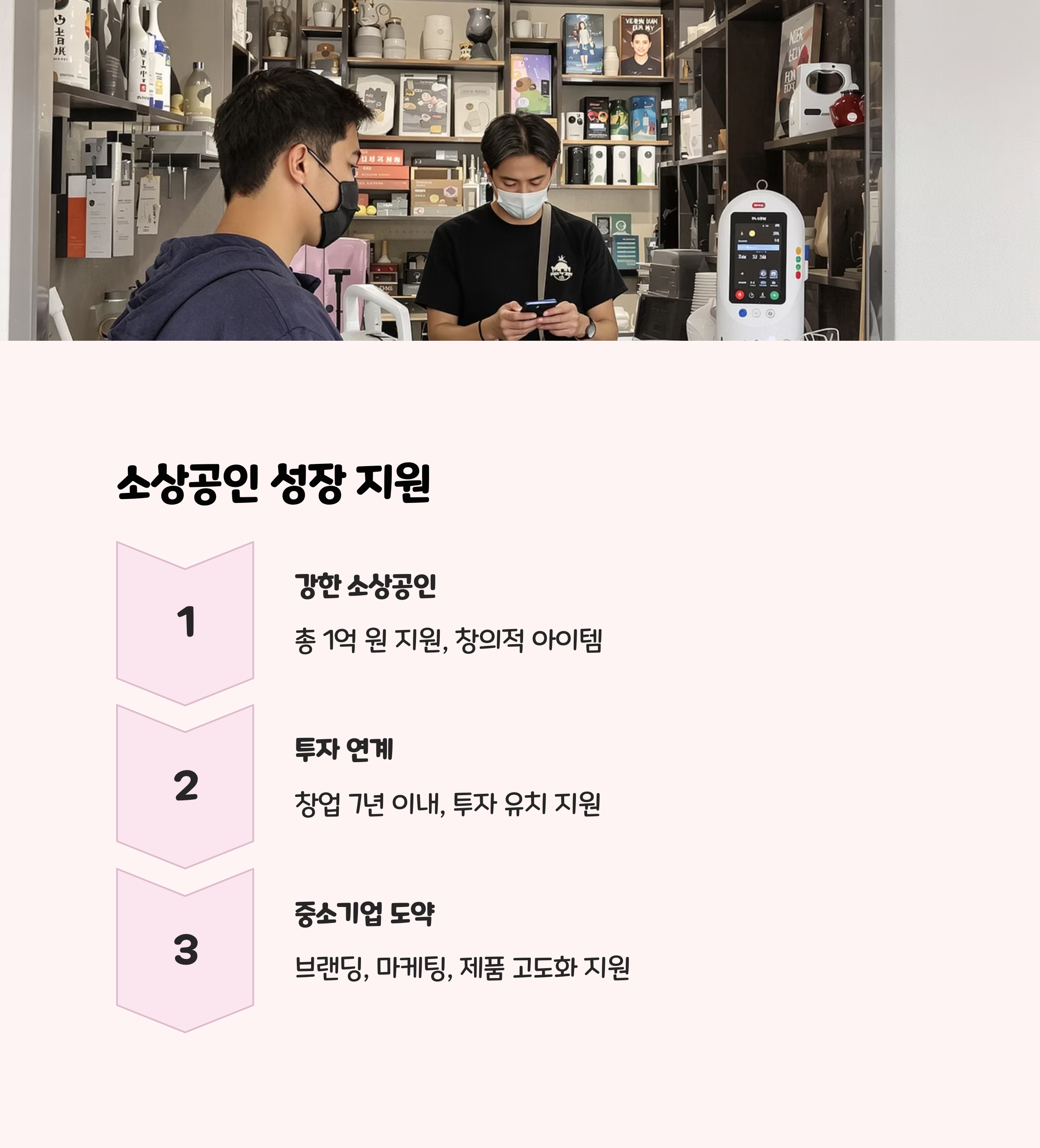 성장 가능성이 있는 소상공인이중소기업으로 도약할 수 있도록 지원하는 프로그램도 있어요. 바로혁신 소상공인 투자 연계 지원이에요 . 이 사업은 소상공인 중에서도투자 유치가 가능한 기업을 발굴하는 것이 목적이에요 .