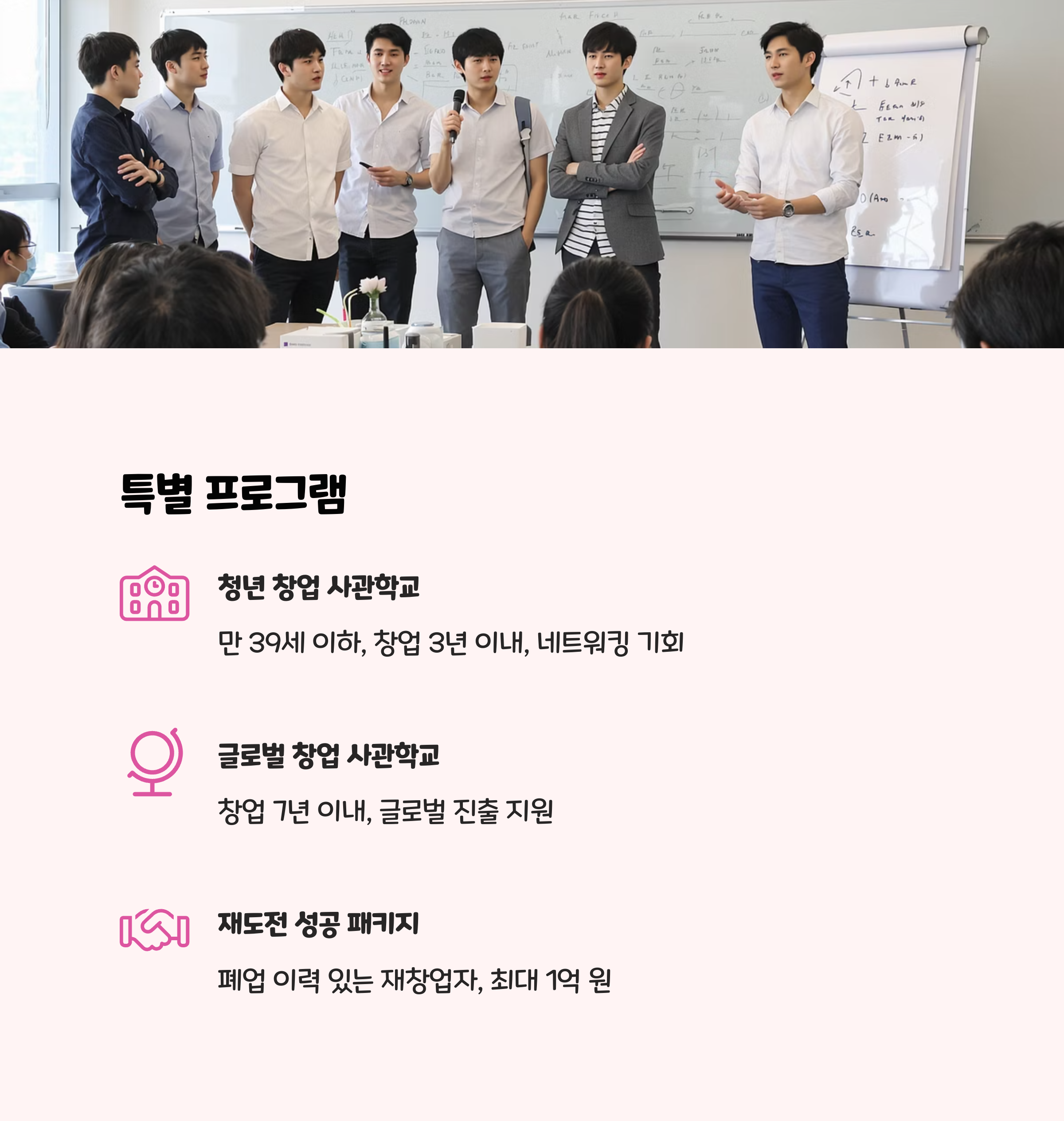 청년 창업가들에게 특히 인기가 많은 프로그램이 있어요. 바로청년 창업 사관학교죠 . 보통 줄여서 '청창사'라고 불러요 . 청창사는창업 3년 이내, 그리고 공고일 기준으로 만 39세 이하인 청년 창업가들이 대상이에요 .