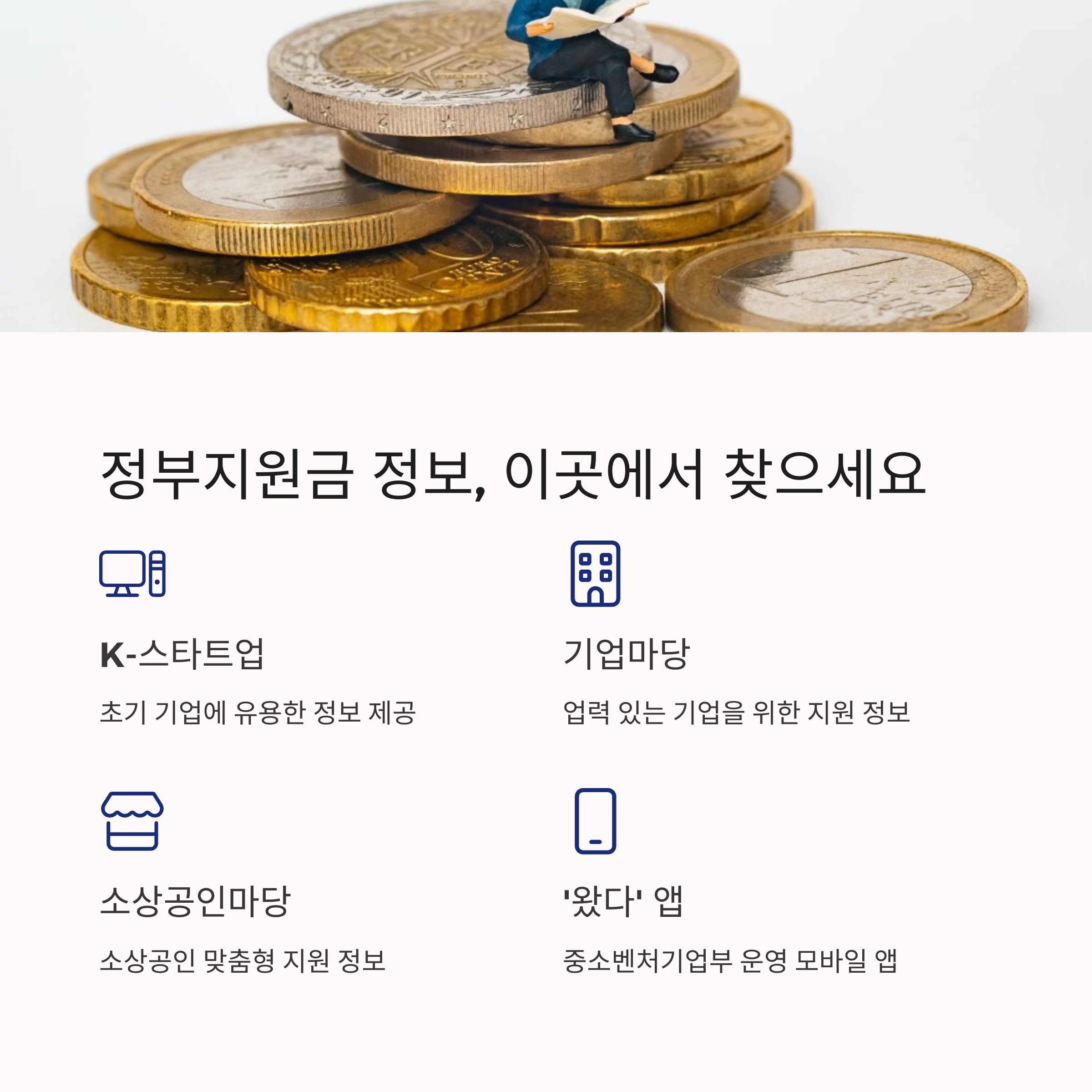 대표적인 사이트로는K-스타트업,기업마당,소상공인마당이 있어요. K-스타트업은 주로 초기 기업에 정보가 많고, 기업마당은업력이 좀 있는 기업에게 유용해요.소상공인마당은 이름처럼소상공인을 위한 정보가 풍부하죠. 마지막으로'왔다'라는 어플도 있는데, 이건 중소벤처기업부에서 운영하는 거예요. 이 사이트들만 잘 살펴봐도 대부분의 정부 사업 공고를 놓치지 않고 볼 수 있답니다.